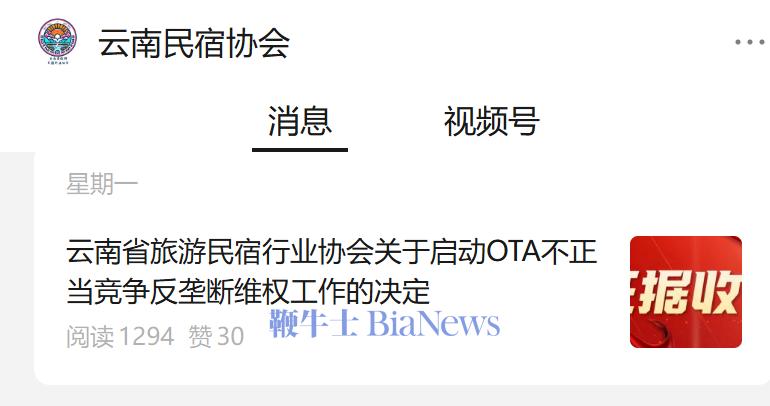 12月10日消息,鞭牛士獲悉,云南民宿協會公眾號近日發布公告,宣布將啟動反壟斷維權工作。