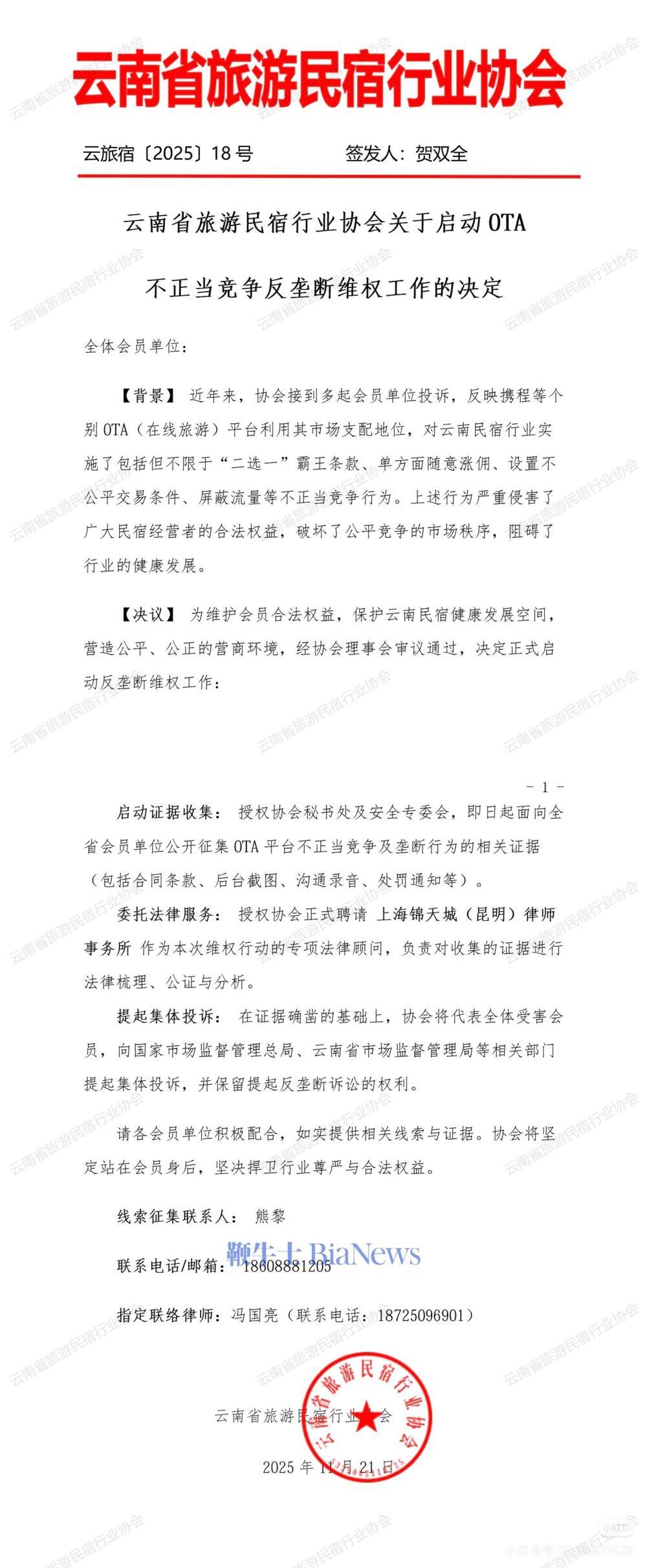 將面向全省會員單位公開征集OTA平臺不正當競爭及壟斷行為的相關證據(包括合同條款、后臺截圖、溝通錄音、處罰通知等),在證據確鑿的基礎上,協會將代表全體受害會員,向國家市場監督管理總局、云南省市場監督管理局等相關部門提起集體投訴,并保留提起反壟斷訴訟的權利。