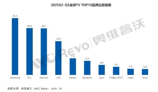 據(jù)市場研究機構(gòu)奧維睿沃發(fā)布的《全球TV品牌出貨月度數(shù)據(jù)報告》顯示,2025年前三季度,索尼電視的出貨量為260萬臺,排名第十位,落后于TCL、海信、小米、創(chuàng)維、海爾一眾中國品牌。