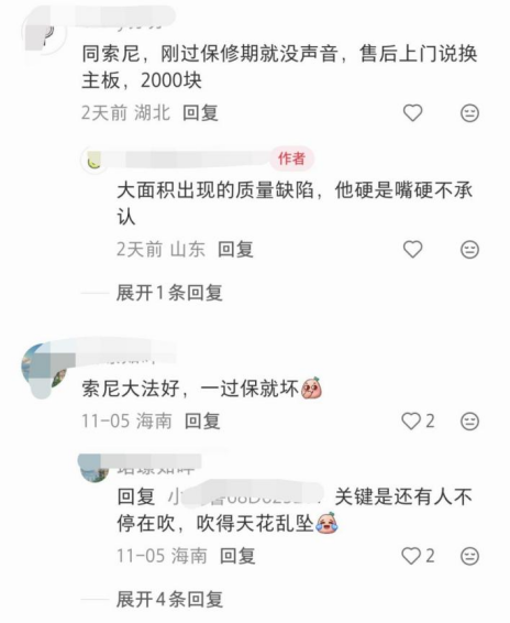 銷量下滑或許主要源于質(zhì)量危機。國內(nèi)多位索尼用戶在社交媒體上表示,購買的萬元索尼電視“剛過保就壞”,維修費用均達數(shù)千元。這些問題集中在至少三款暢銷型號上,眾人表示“集中爆發(fā),就是質(zhì)量問題,或者是設(shè)計缺陷”。