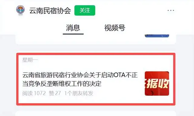 12月10日云南民宿協(xié)會發(fā)布《云南省旅游民宿行業(yè)協(xié)會關(guān)于啟動OTA不正當競爭反壟斷維權(quán)工作的決定》一文。
