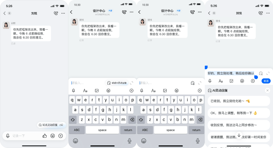 AI可以基于當(dāng)前聊天對(duì)話的上下文,識(shí)別用戶與對(duì)話對(duì)象的身份及組織關(guān)系,自動(dòng)生成4-6條涵蓋簡(jiǎn)潔、專業(yè)、主動(dòng)確認(rèn)、輕松活潑等多種語(yǔ)言風(fēng)格、不同語(yǔ)氣口吻的回復(fù)建議。用戶可在此基礎(chǔ)上再次編輯后發(fā)送,既保持個(gè)性表達(dá),又大幅降低組織措辭的時(shí)間成本。