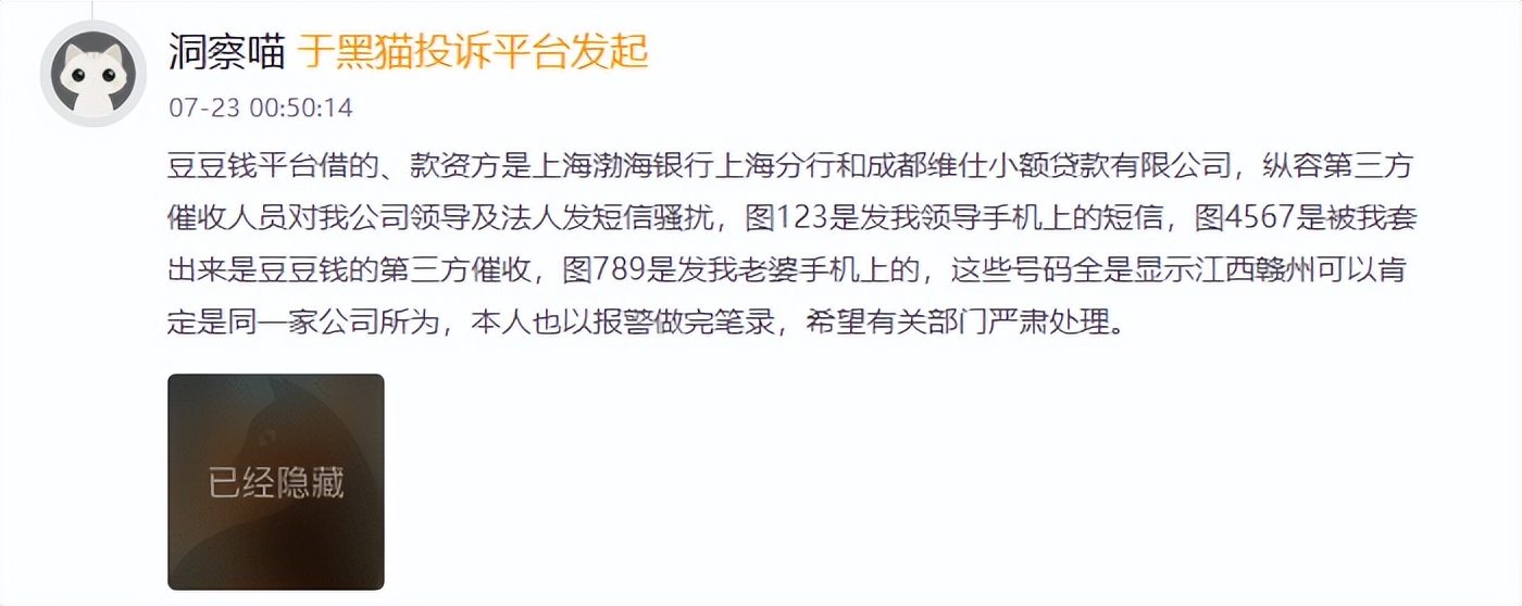 事實上,在今年7月份的投訴中,還有借款人提到豆豆錢的放款方有成都維仕小貸公司。