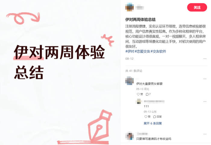 “伊對大量要,男女都要(指‘賬號’)”“49b***(注:邀請碼),流量超級好”“收伊對,不用實名,注冊滿三天就行”……在小紅書平臺上,檢索關(guān)鍵詞“伊對”,不少推文基本都會出現(xiàn)這些評論。
