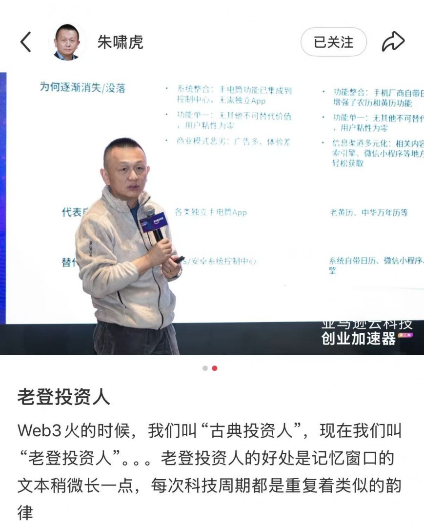 朱嘯虎還在個人社交平臺號上發布了出席亞馬遜云科技第三期創業加速器現場的圖片。