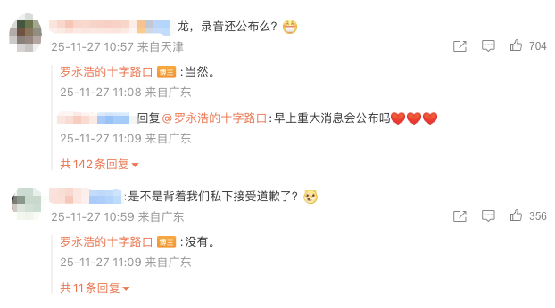 11月27日上午,羅永浩在微博更新了一條博文,有網友在評論區詢問:“錄音還公布么?”羅永浩回復稱:“當然。”