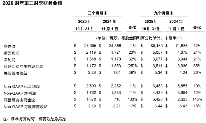 戴爾科技2026財年第三財季營收達270億美元,創歷史新高,同比增長11%;每股攤薄收益為2.28美元,同比增長39%;non-GAAP 每股攤薄收益達創紀錄的2.59美元,增長17%;凈利潤15.48億美元,同比增長32%。